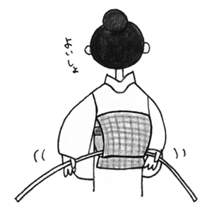 お太鼓の一番下の部分にそわせて(下記イラスト参照)後ろからとおし、その下へ引っ張る様に両端をもって動かします。